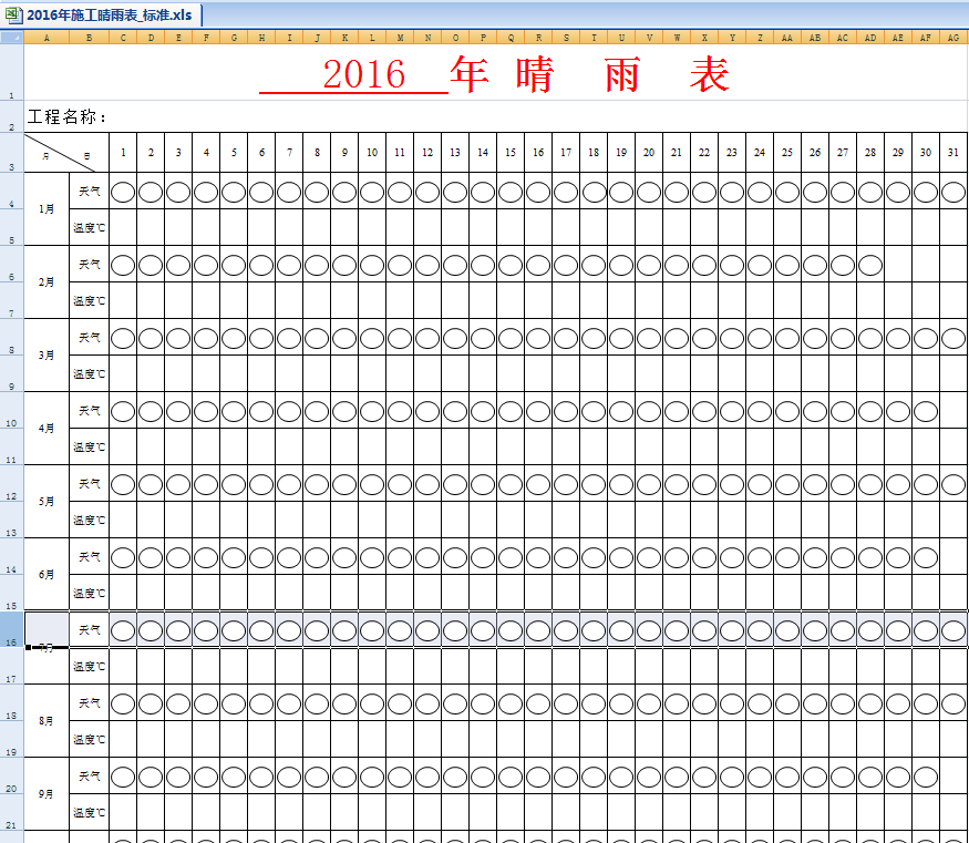 2016年施工晴雨表分享給需要的朋友,建筑施工對于天氣的了解是很重要的,可以讓你對施工進行合理的安排,施工晴雨表來記錄是很有必要的,小編這里分享一個空白標準的2016年施工晴雨表,趕緊下載吧。