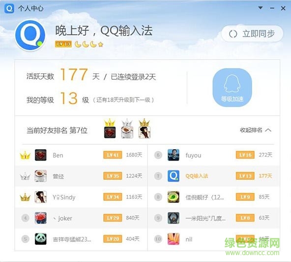 通過(guò)登錄QQ賬號(hào),可以查看您使用QQ輸入法的QQ好友等級(jí)排名。點(diǎn)擊“查看排名”,可顯示您的QQ好友中排名前十的好友列表,如果您不在好友排名的前十名內(nèi),將顯示您QQ輸入法排名前九位的好友,以及您自己的排名情況。