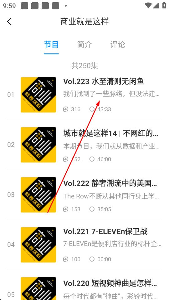 3、進(jìn)入節(jié)目頁面后,會(huì)看到各個(gè)音頻集數(shù)列表,選擇想聽的集數(shù),點(diǎn)擊進(jìn)入。