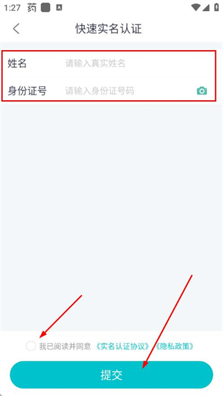 3、在快速實(shí)名認(rèn)證頁(yè)面輸入姓名、身份證號(hào),勾選同意協(xié)議后點(diǎn)擊提交按鈕,完成實(shí)名認(rèn)證操作。
