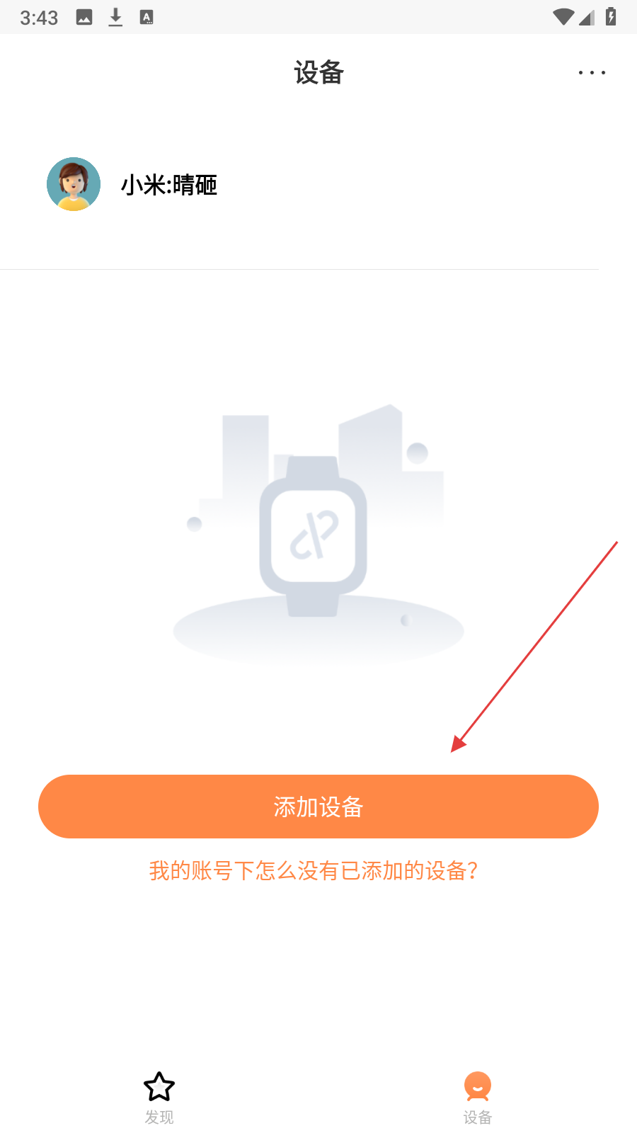 1、打開(kāi)米兔應(yīng)用,進(jìn)入設(shè)備頁(yè)面,點(diǎn)擊頁(yè)面中間顯眼的橙色添加設(shè)備按鈕,進(jìn)入添加設(shè)備的具體操作界面。