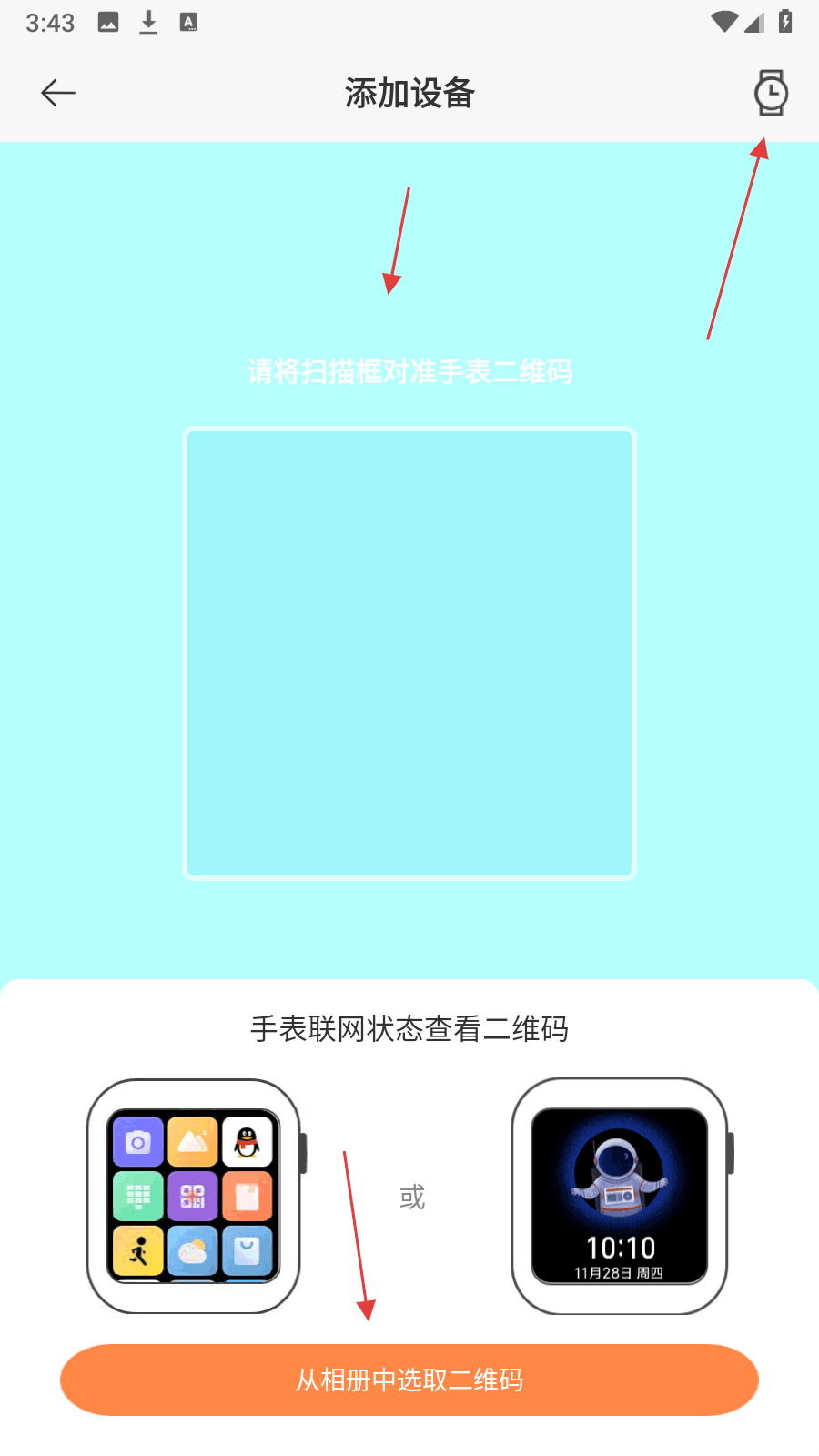 2、選擇掃碼綁定方式,將手機(jī)的掃描框?qū)?zhǔn)手表屏幕上顯示的二維碼,或者點(diǎn)擊從相冊(cè)中選取二維碼選項(xiàng),或者點(diǎn)擊右上角。