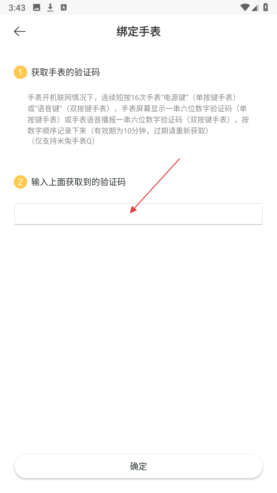3、進(jìn)入手動(dòng)驗(yàn)證碼綁定界面,按照提示獲取驗(yàn)證碼,然后輸入到綁定手表頁(yè)面的輸入框中,點(diǎn)擊確定按鈕完成設(shè)備綁定。