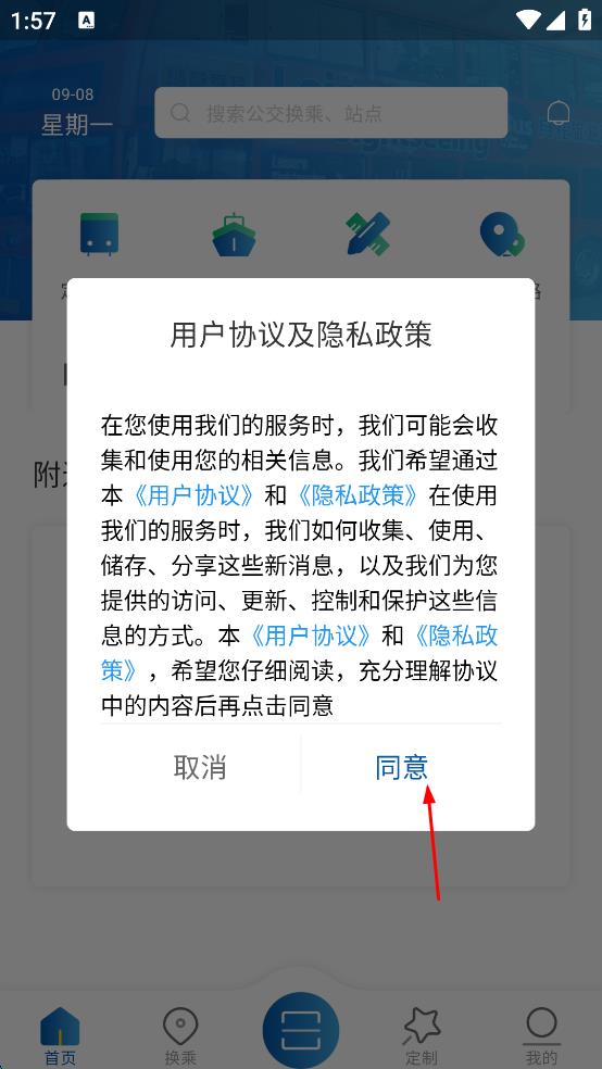 1、打開舟山公交APP,彈出用戶協(xié)議及隱私政策提示,仔細(xì)閱讀相關(guān)內(nèi)容后,點(diǎn)擊“同意”按鈕,進(jìn)入APP主界面。
