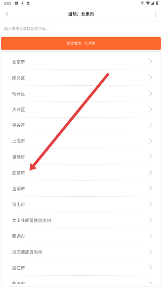 2、在城市列表中找到想定位的城市比如曲靖市并點擊,完成定位城市切換,獲取該城市的公交站點及線路數(shù)據(jù)。