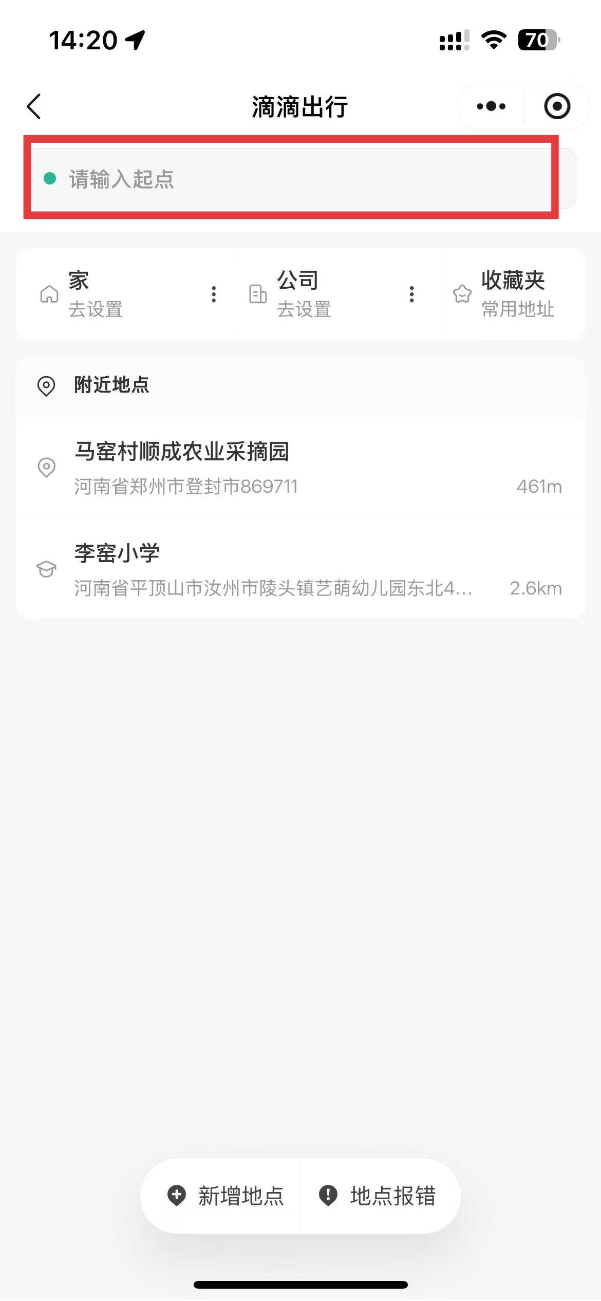 3、點擊輸入框設(shè)定打車的出發(fā)地點,若有常用地點也可直接選擇。