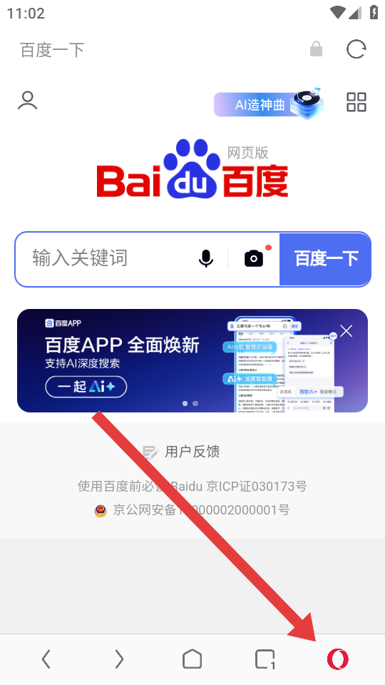 1、在歐朋瀏覽器的頁面,找到需要收藏的頁面后,調出底部功能菜單如點擊右下角圓形圖標。