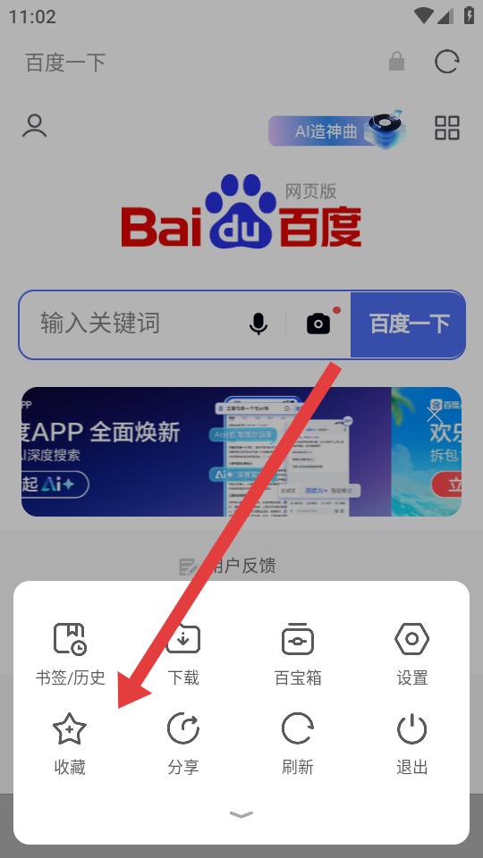 2、彈出瀏覽器的系統(tǒng)功能菜單,這邊我們需要點擊左下角代表星星的收藏圖標。