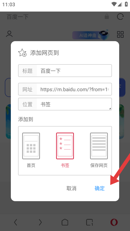 3、然后選擇書簽的選項,確認信息無誤后,點擊窗口右下角確定,即可將當前的網(wǎng)頁添加到書簽里。