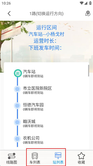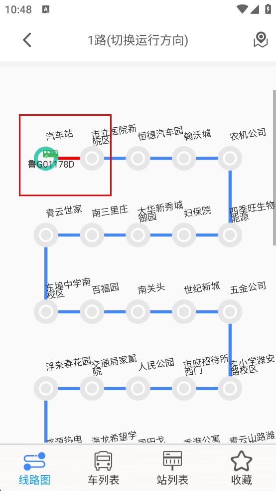 4、點擊后進入到“1路”公交的線路圖頁面,可查看該線路的站點分布以及公交實時位置等信息,方便規(guī)劃出行。