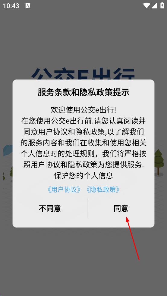 1、打開公交e出行應用,彈出“服務條款和隱私政策提示”框,認真閱讀后點擊“同意”,進入到應用主界面。