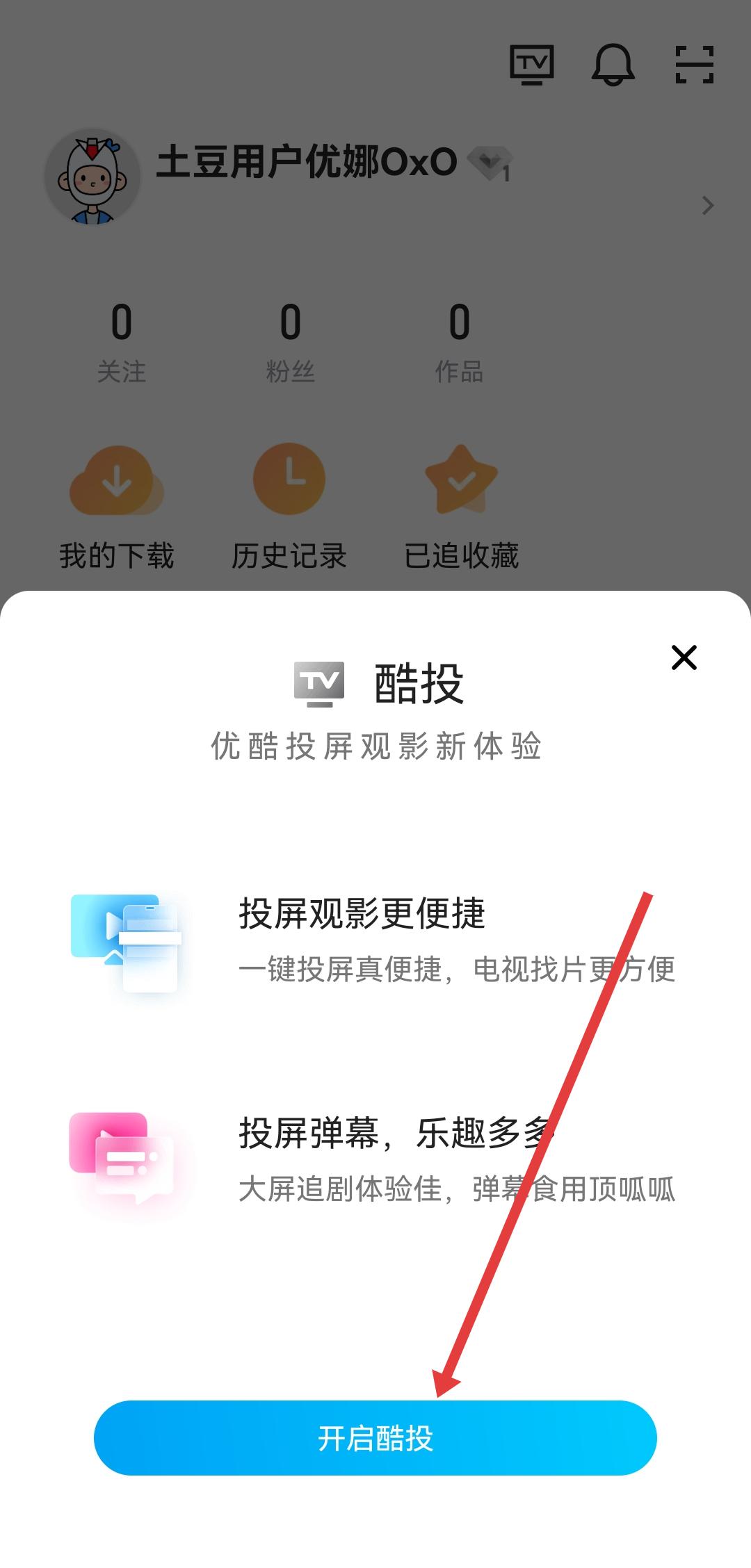 2、在彈出的酷投提示框中,需要點(diǎn)擊開啟酷投按鈕,以此進(jìn)入投屏準(zhǔn)備環(huán)節(jié)。