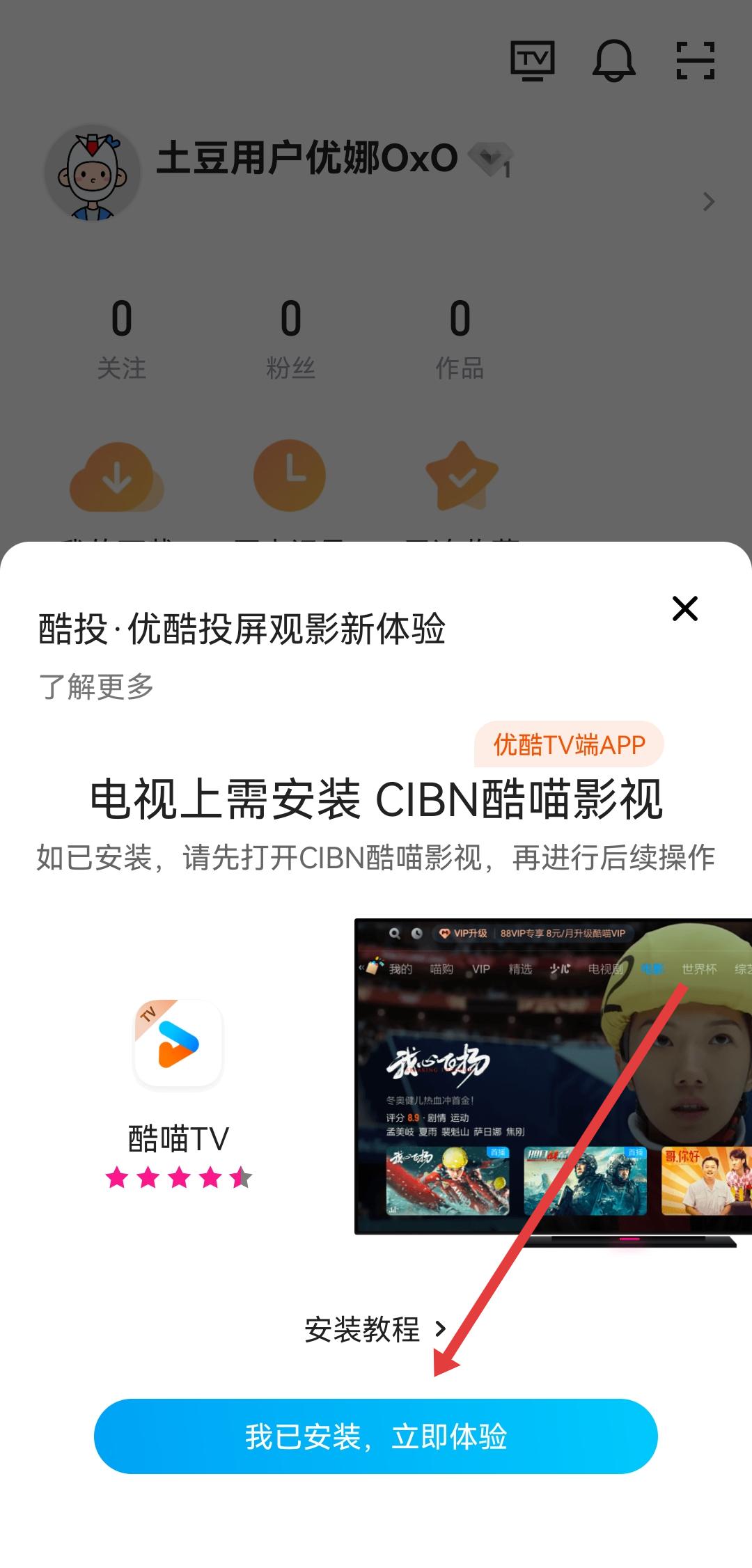 3、確認(rèn)電視已安裝CIBN酷喵影視后,點(diǎn)擊我已安裝,立即體驗按鈕,即可進(jìn)行投屏操作。