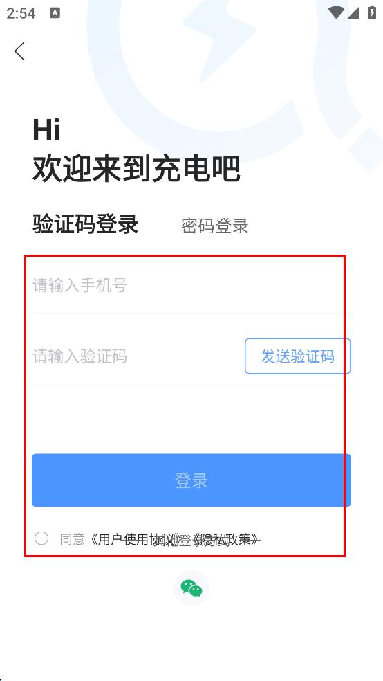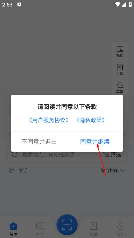 1、打開充電吧APP,在條款閱讀彈窗中,點擊同意并繼續(xù)按鈕,進入主界面。
