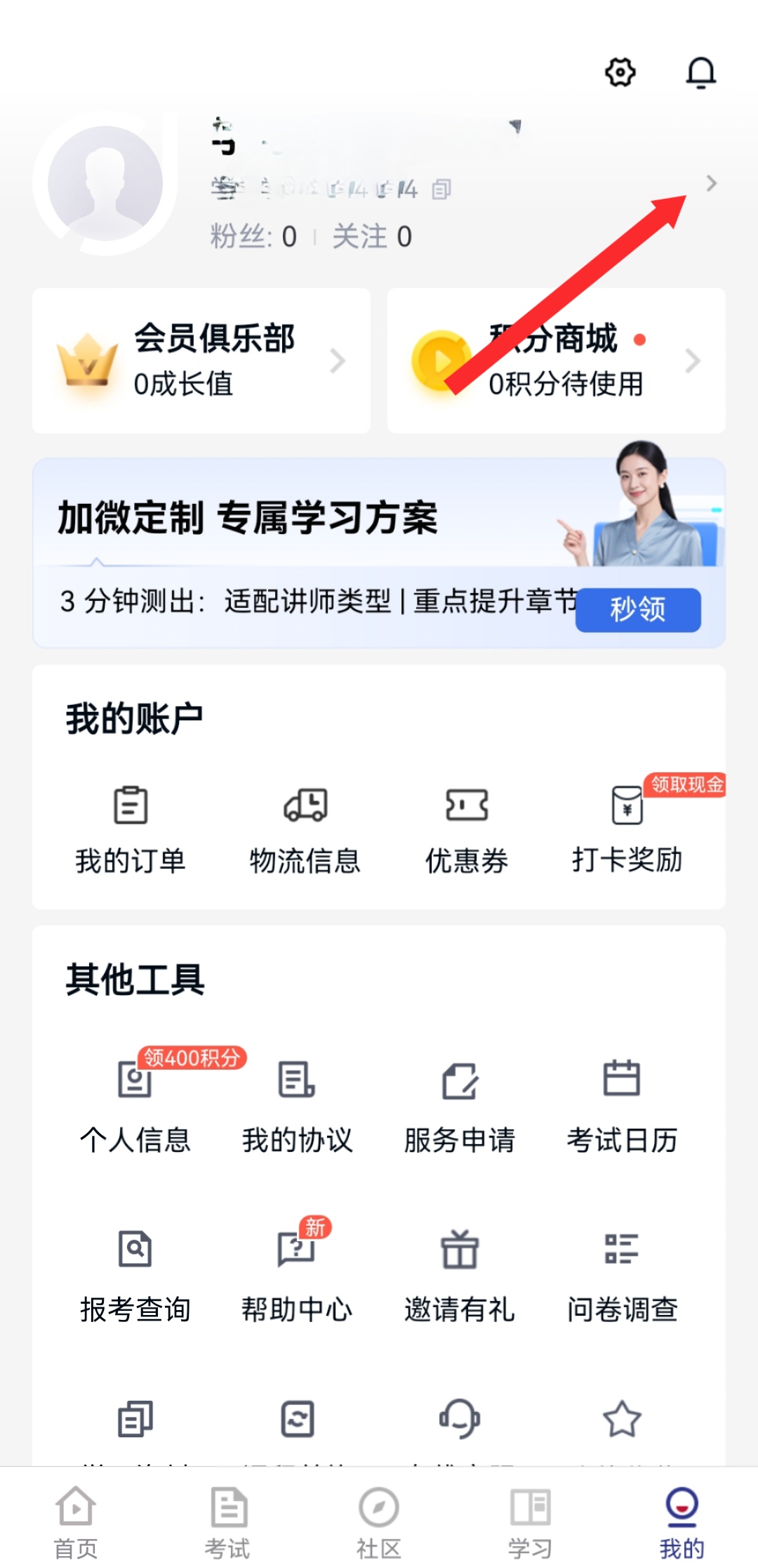 1、在環(huán)球網(wǎng)校app我的頁面中,點擊右上角按鈕,進入個人信息界面。