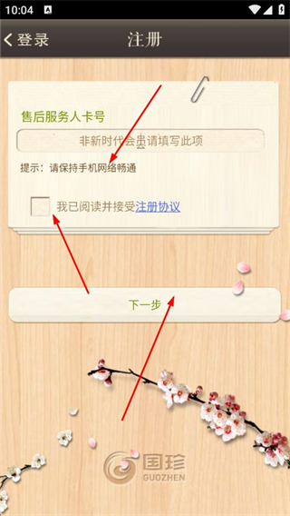 3、在登錄頁面點擊“注冊”選項,進(jìn)入注冊頁面后填寫售后服務(wù)人卡號,勾選“我已閱讀并接受注冊協(xié)議”。