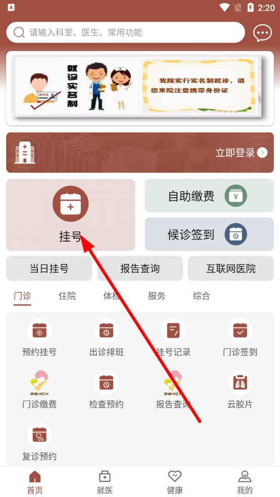 1、打開甘肅婦幼APP,點擊底部「就醫(yī)」模塊,在功能區(qū)找到「掛號」按鈕并點擊,開啟預約掛號流程。