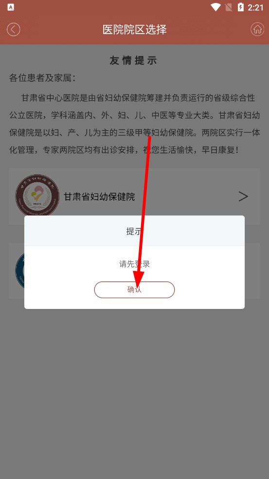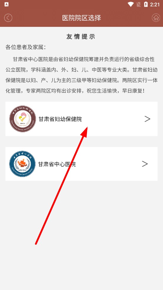 2、跳轉至院區(qū)選擇頁面,可選擇「甘肅省中心醫(yī)院」或者「甘肅省婦幼保健院」選項,點擊進入。