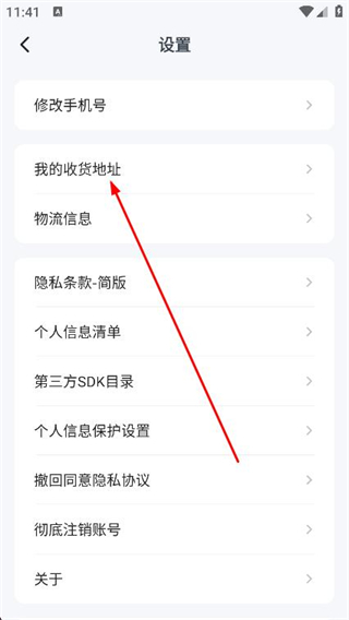 3、在設(shè)置頁(yè)面里,找到并點(diǎn)擊我的收貨地址選項(xiàng)。