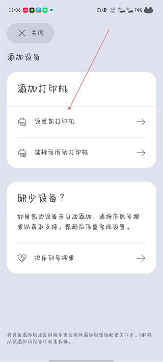 1、打開惠普云打印應用,在主界面點擊添加設備,進入添加設備頁面。