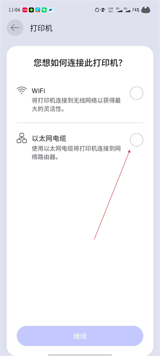 3、在彈出的您想如何連接此打印機?界面中,選擇以太網電纜選項。