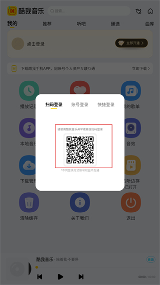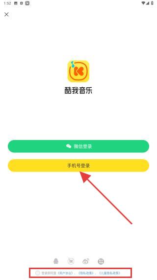1、打開(kāi)酷我音樂(lè)APP,會(huì)直接彈出登錄頁(yè)面,在界面內(nèi)點(diǎn)擊手機(jī)號(hào)登錄。
