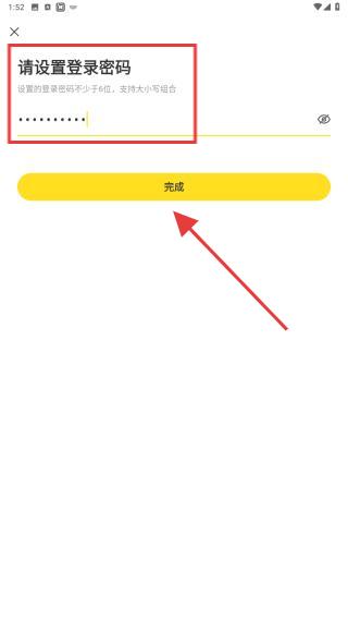 3、進(jìn)入密碼設(shè)置頁(yè)面,按提示設(shè)置至少6位、包含大小寫(xiě)字母的登錄密碼,確認(rèn)密碼后點(diǎn)擊完成,即可完成密碼設(shè)置。