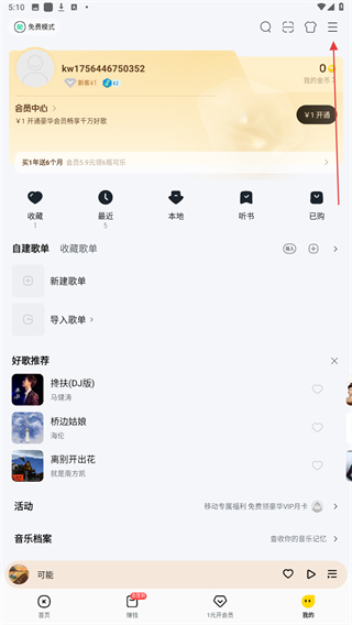 1.點(diǎn)擊手機(jī)酷我音樂(lè)右上角的【菜單】