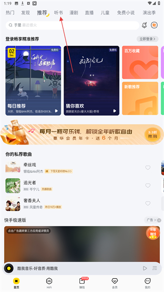 1、打開(kāi)酷我音樂(lè)盒APP,進(jìn)入時(shí)點(diǎn)擊上方聽(tīng)書(shū)的標(biāo)簽。