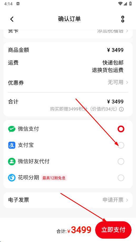 3、進(jìn)入確認(rèn)訂單頁面,在支付方式中點擊選擇支付寶,點擊立即支付。