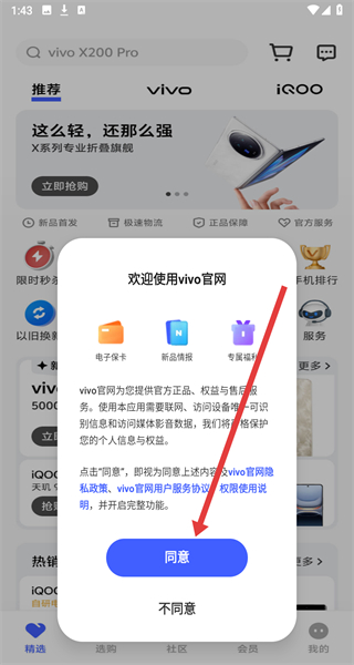 1、在進(jìn)入到vivo應(yīng)用中,可以點擊彈窗中的同意按鈕后,開始使用。