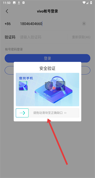 3、在點擊獲取驗證碼按鈕后,完成安全驗證拖動滑塊至正確缺口。