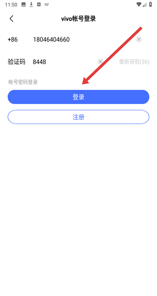 4、在驗證碼輸入框輸入收到的驗證碼后點擊“登錄”按鈕,完成vivo帳號的登錄操作。
