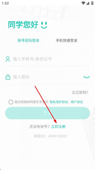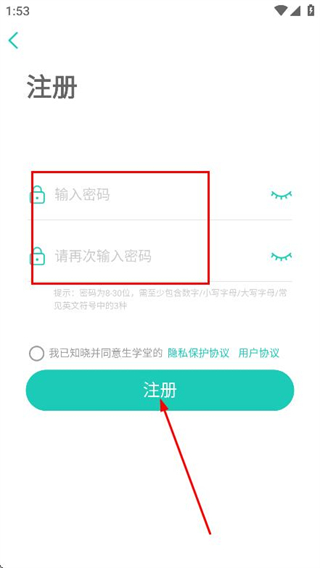 1、打開生學堂app,在登錄頁面,點擊立即注冊選項。