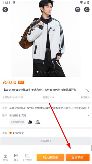 2、在商品詳情頁(yè)面,查看商品信息,選擇好顏色尺碼后,點(diǎn)擊立即購(gòu)買選項(xiàng)。