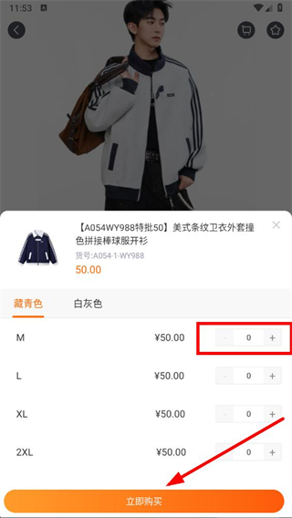 3、若點(diǎn)擊立即購(gòu)買,在彈出的頁(yè)面中,選擇商品顏色尺碼,并通過(guò)加號(hào)按鈕選擇購(gòu)買數(shù)量,再次點(diǎn)擊立即購(gòu)買。