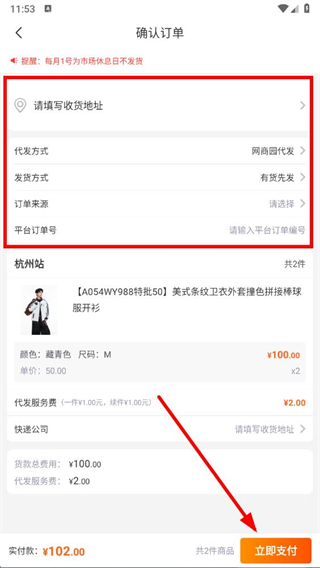 4、進(jìn)入確認(rèn)訂單頁(yè)面,填寫(xiě)收貨地址,選擇代發(fā)方式、發(fā)貨方式等信息,確認(rèn)訂單信息無(wú)誤后,點(diǎn)擊立即支付完成下單。