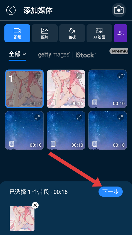 2、在添加媒體界面,選擇要剪切的視頻片段后,點(diǎn)擊右下角下一步。