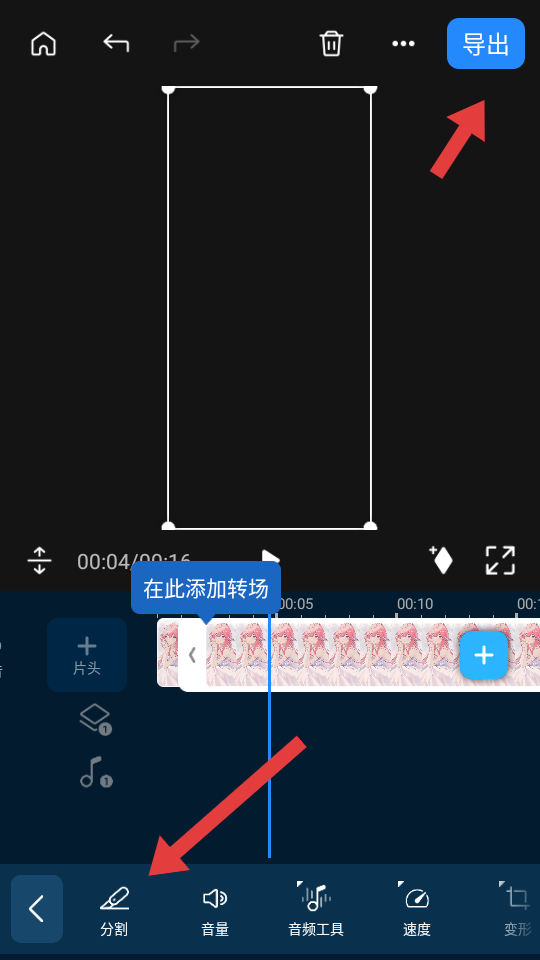 3、進(jìn)入視頻編輯界面,找到剪切點(diǎn)點(diǎn)擊分割,完成后點(diǎn)擊右上角導(dǎo)出。