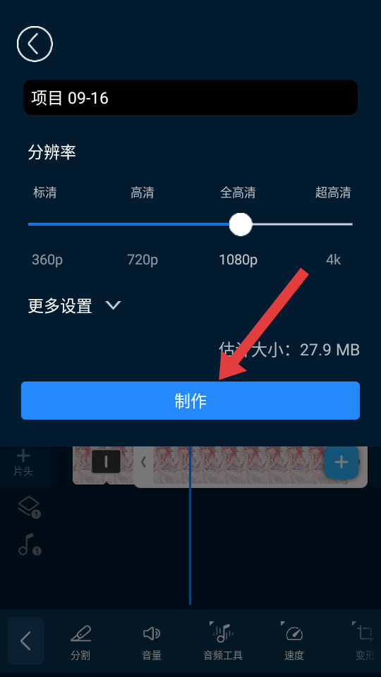 4、在導(dǎo)出頁(yè)面選擇分辨率,點(diǎn)擊制作的按鈕,導(dǎo)出剪切后的視頻。