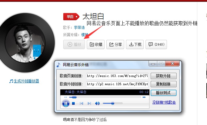 李榮浩的"太坦白",網(wǎng)易云音樂(lè)頁(yè)面上播放按鈕是灰色的,用這個(gè)工具獲取到外鏈仍然能播放