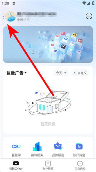 1、打開巨量引擎APP,點擊左上角的個人圖標,展開側(cè)邊欄。