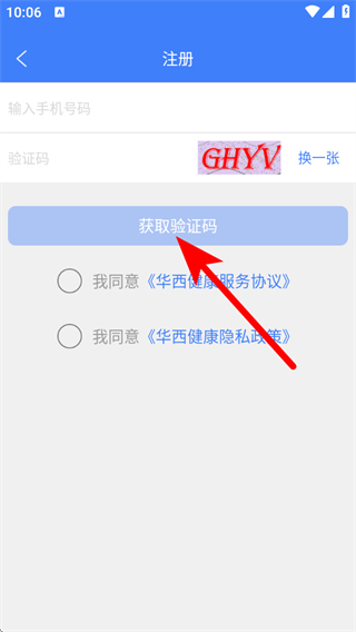4、輸入手機(jī)號(hào)、驗(yàn)證碼并勾選協(xié)議后,完成華西健康賬號(hào)注冊(cè)操作。