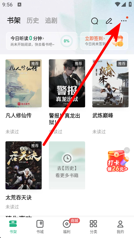 2、在書架頁面,點(diǎn)擊右上角三點(diǎn)按鈕,彈出功能列表。