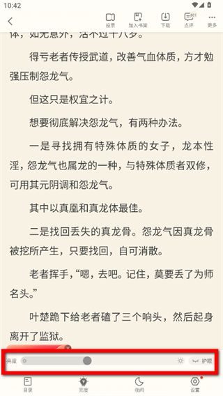 3、在亮度調(diào)節(jié)條上,左右拖動調(diào)節(jié)按鈕,即可調(diào)整閱讀界面的亮度。