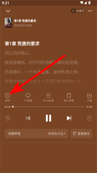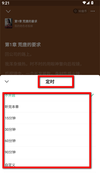 3、在聽書界面,點(diǎn)擊定時選項(xiàng),展開定時設(shè)置菜單。