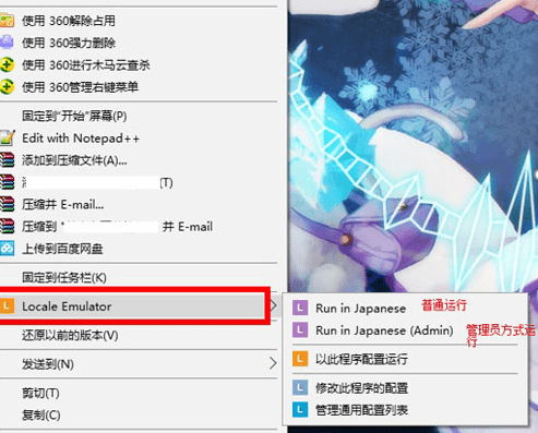 4.接下來找到日文游戲的圖標(biāo),右鍵選擇【Locale Emulator】——【以此程序配置運(yùn)行】即可。然后游戲會直接運(yùn)行,里面的文本也會回歸正常的日文顯示。