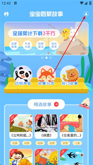 1、打開寶寶啟蒙故事早教,點(diǎn)擊右上角個(gè)人中心圖標(biāo)。