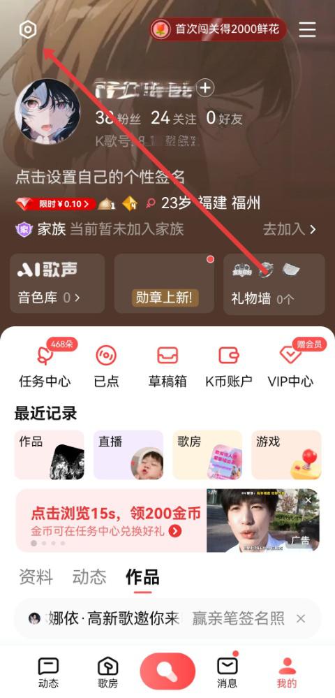 1、進入全民K歌我的頁面,點擊左上角的設(shè)置圖標(biāo),進入設(shè)置界面,這是操作的起始步驟。