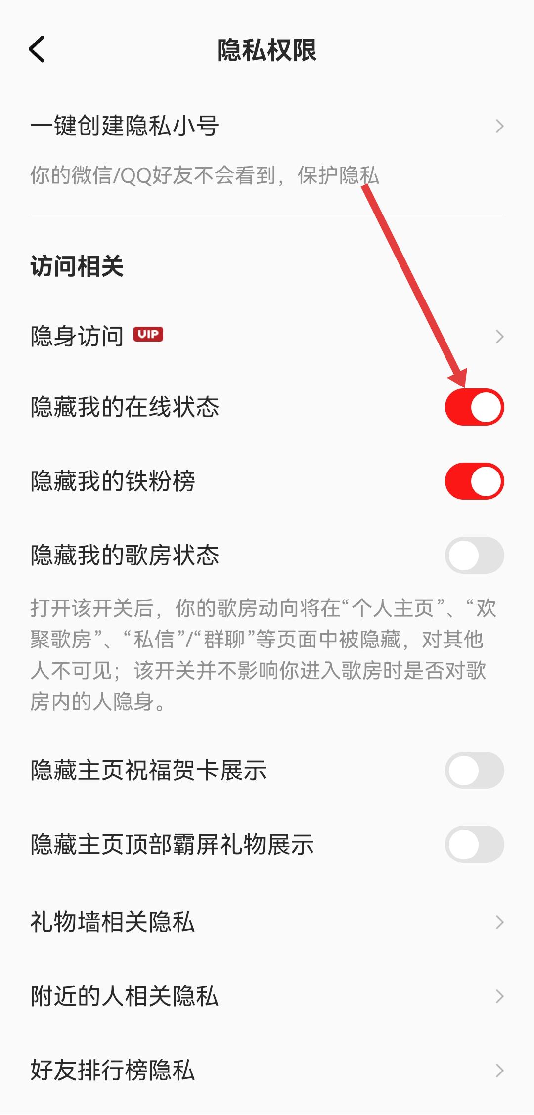 3、在隱私權(quán)限頁面里,找到隱藏我的在線狀態(tài)選項,點擊右側(cè)的開關(guān)按鈕將其開啟,即可成功隱藏在線狀態(tài)。